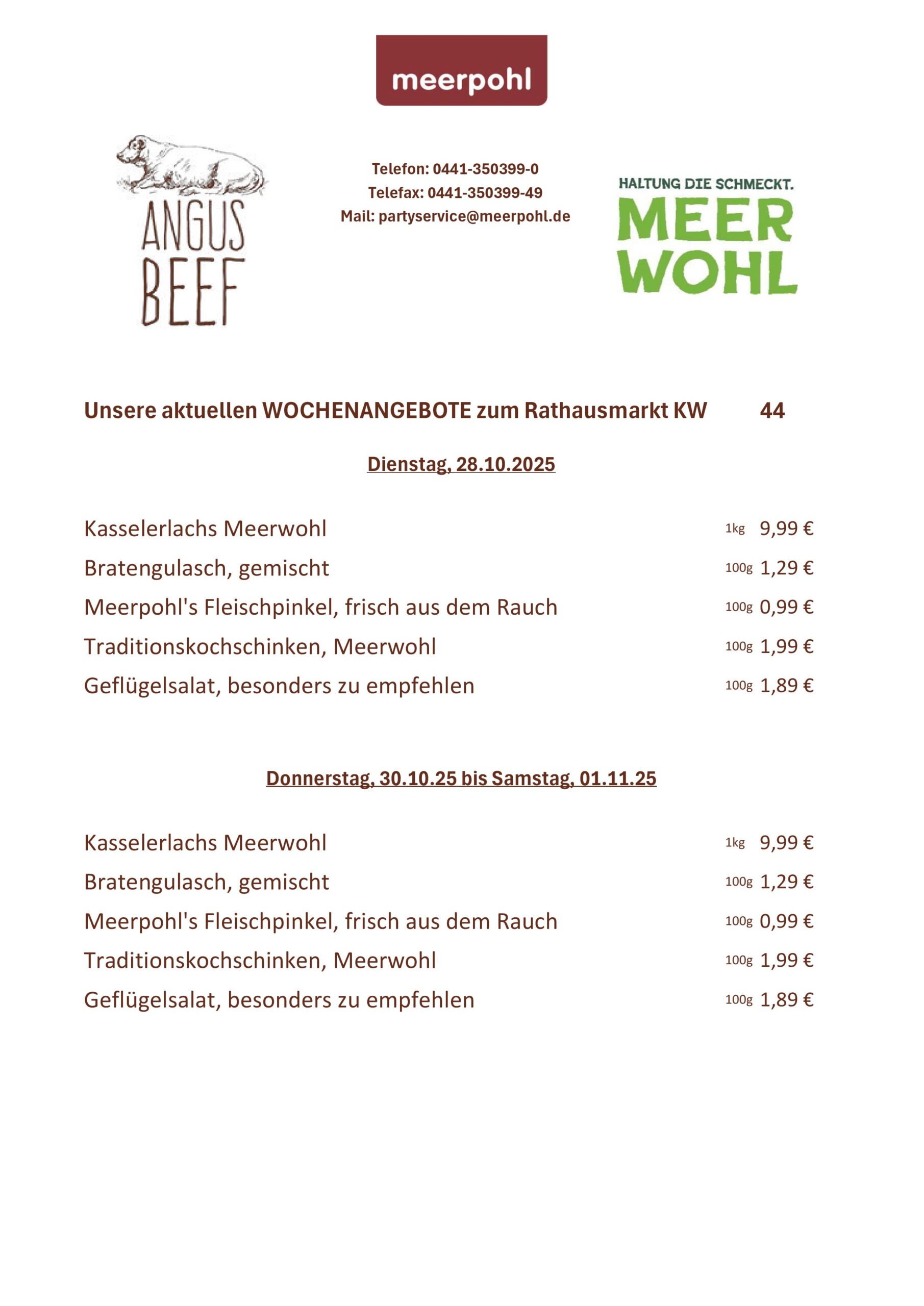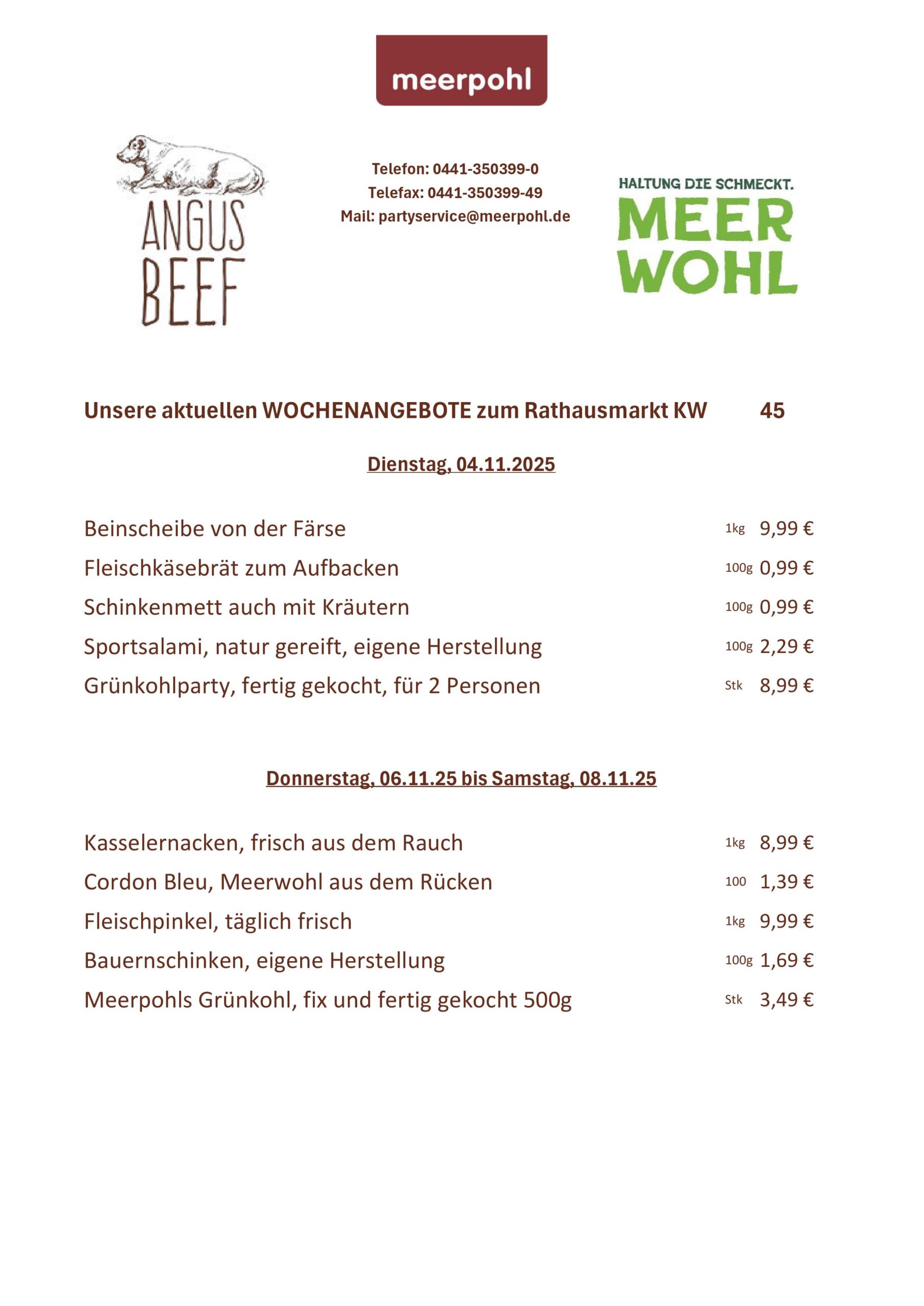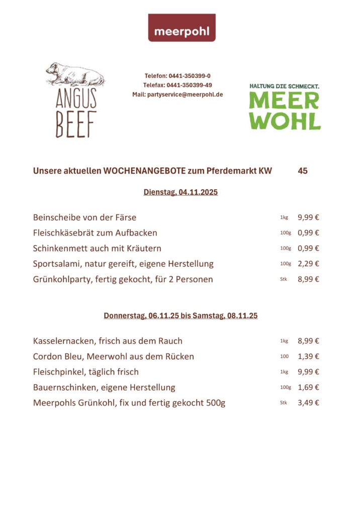 Seit vielen Jahren sind wir stolz darauf, Ihnen hochwertige Fleisch- und Wurstwaren anzubieten. Neben unserem Ladengeschäft freuen wir uns auch, Sie auf den Wochenmärkten in der Umgebung begrüßen zu dürfen. Besuchen Sie uns doch auf den Märkten am Rathausplatz, Pferdemarkt, Wüsting und Hude – dort erwarten Sie unsere frischen Produkte und ein freundliches Meerpohl-Team.