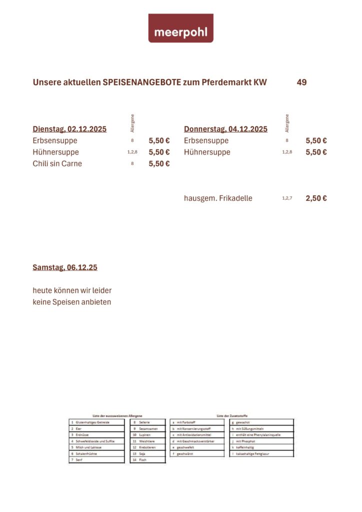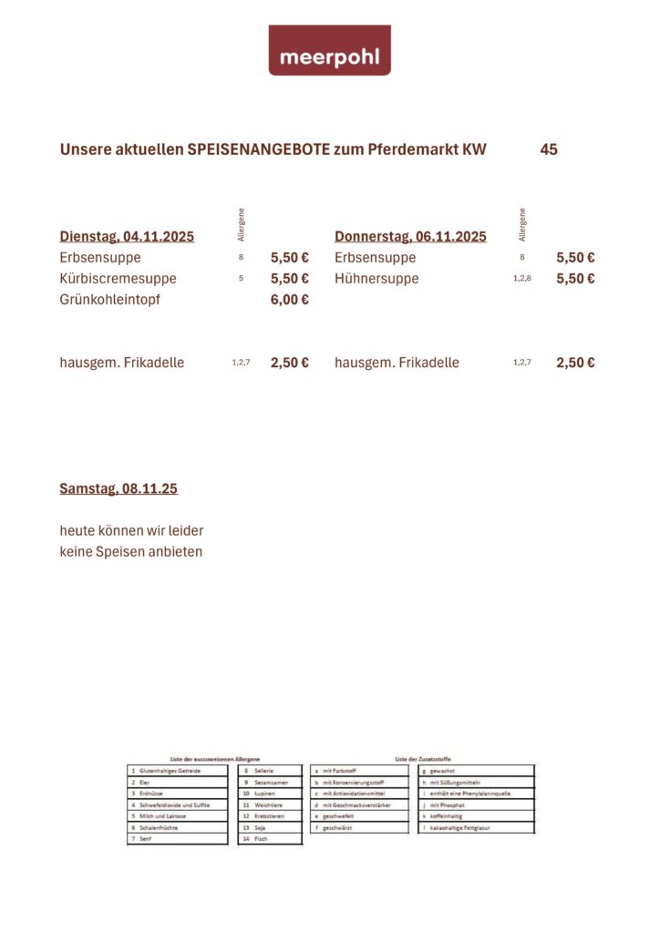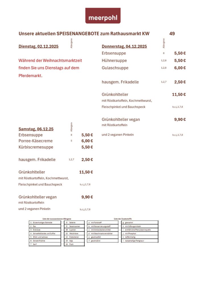 - Pferdemarkt: Auch auf dem Pferdemarkt laden wir Sie herzlich ein, unsere kulinarischen Kreationen zu entdecken. Lassen Sie sich nicht nur von unserem breiten Angebot verführen, sondern gönnen Sie sich auch eine Pause bei unserem Mittagstisch.