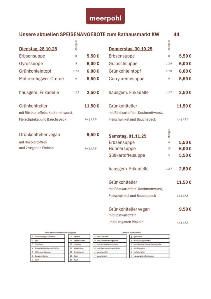 - Rathausmarkt: Hier erwartet Sie nicht nur unser vielfältiges Produktsortiment, sondern auch eine besonderer Leckerbissen – unser Mittagstisch. Genießen Sie eine warme Mahlzeit aus ausgewählten Produkten und begleitenden Beilagen.